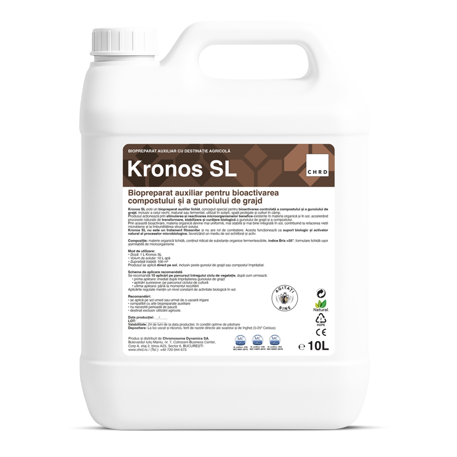 Kronos SL este un biopreparat auxiliar lichid, conceput special pentru bioactivarea controlată a compostului și a gunoiului de grajd, inclusiv a celui vechi, maturat sau fermentat, utilizat în solarii, spații protejate și culturi în câmp. Produsul acționează prin stimularea și reactivarea microorganismelor benefice existente în materia organică și în sol, accelerând procesele naturale de transformare, stabilizare și curățare biologică a gunoiului de grajd și a compostului.