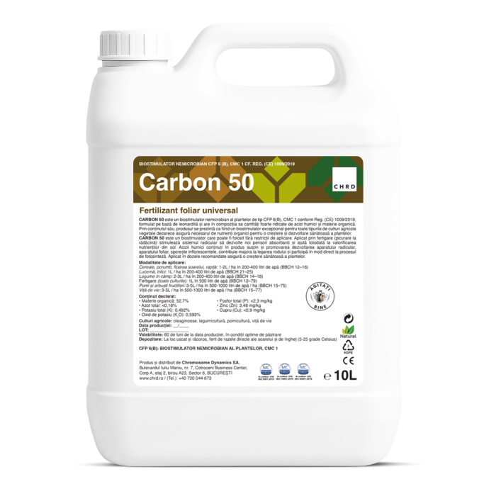 CARBON 50™ este un biostimulator nemicrobian formulat pe bază de fracții humificate de origine leonarditică, cu un conținut ridicat de materie organică și acizi humici, destinat utilizării universale în culturile agricole și horticole. Produsul este conceput pentru a interveni direct asupra zonei radiculare și a funcționării generale a plantei, având ca obiectiv principal creșterea eficienței utilizării nutrienților existenți în sol și stabilizarea proceselor fiziologice pe întreg ciclul de vegetație. Aplicat prin fertigare sau foliar, CARBON 50™ acționează ca un element de bază în managementul nutriției, fără a impune constrângeri tehnologice sau limitări de compatibilitate.