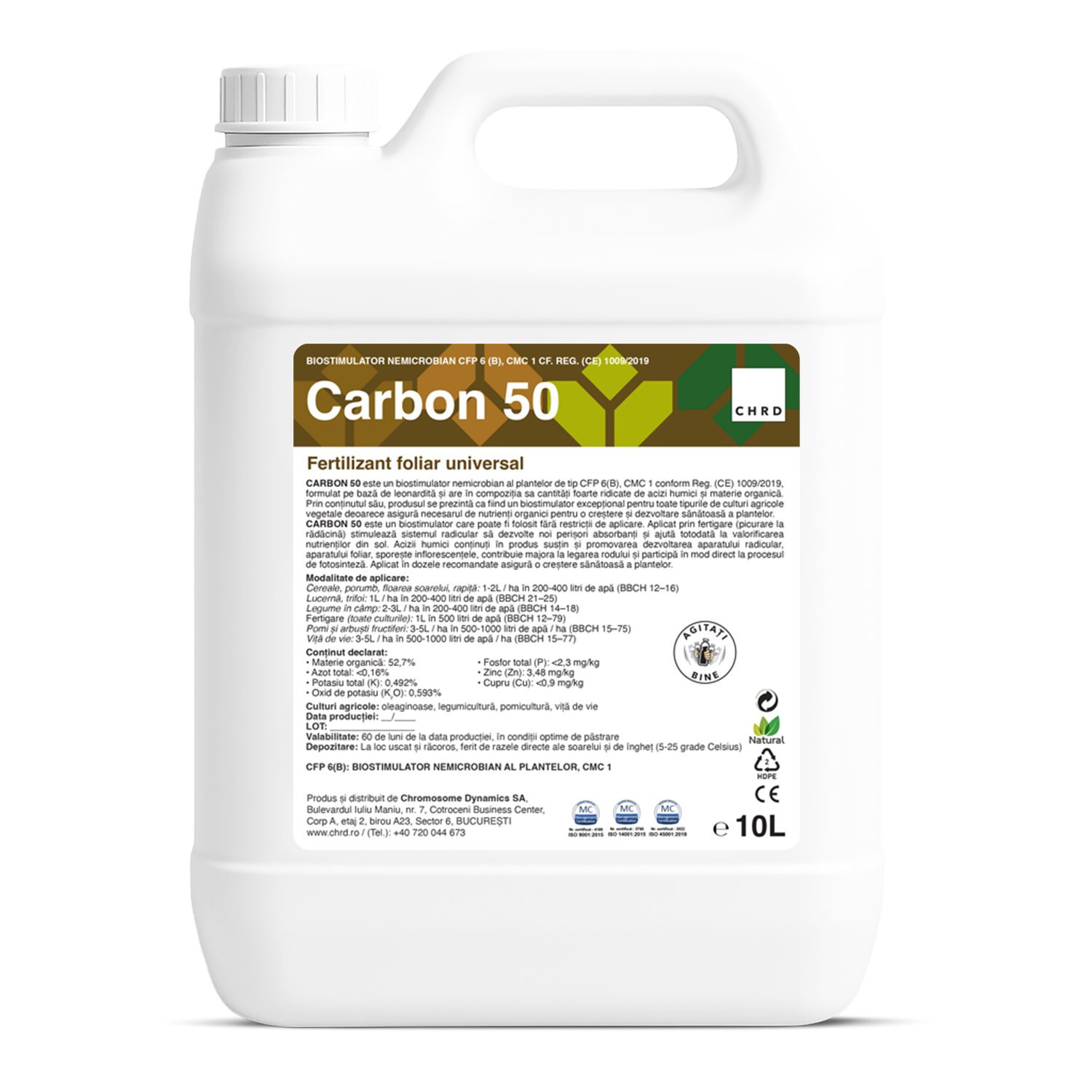 CARBON 50™ este acceptat ca input organic în agricultura ecologică conform Regulamentului (UE) 848/2018, fără restricții de utilizare, și poate fi aplicat pe o gamă largă de culturi, de la oleaginoase și cereale, până la legumicultură, pomicultură și viticultură. Versatilitatea produsului permite integrarea sa atât în programe de pornire timpurie în vegetație, cât și în faze avansate, când cererea de nutrienți și stabilitatea fiziologică sunt critice pentru calitatea și cantitatea producției.