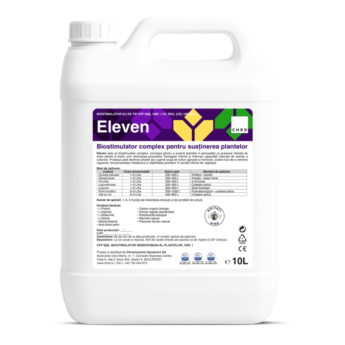 ELEVEN® este un biostimulator complex, conceput pentru a susține plantele în perioadele cu presiune ridicată de stres abiotic și biotic, prin stimularea proceselor fiziologice interne și întărirea capacității naturale de reacție a culturilor. Produsul este destinat utilizării pe o gamă largă de culturi agricole și horticole, având rolul de a menține vigoarea, funcționalitatea metabolică și stabilitatea plantelor în condiții dificile de vegetație.