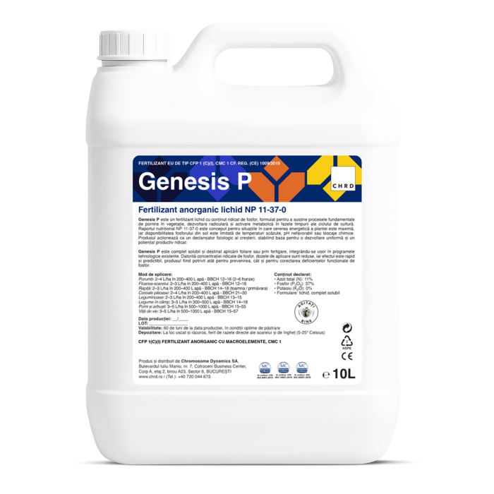 GENESIS P™ este un fertilizant lichid cu conținut ridicat de fosfor, formulat pentru a susține procesele fundamentale de pornire în vegetație, dezvoltare radiculară și activare metabolică în fazele timpurii ale ciclului de cultură. Raportul nutrițional NP 11-37-0 este conceput pentru situațiile în care cererea energetică a plantei este maximă, iar disponibilitatea fosforului din sol este limitată de temperaturi scăzute, pH nefavorabil sau blocaje chimice. Produsul acționează ca un declanșator fiziologic al creșterii, stabilind baza pentru o dezvoltare uniformă și un potențial productiv ridicat.