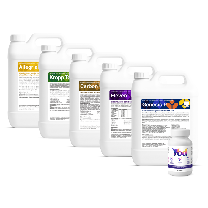 În program, Genesis P aduce un aport important pentru susținerea proceselor de creștere și formare, iar Kropp Top și Allegria completează schema pentru o nutriție coerentă și ușor de aplicat pe etape. Carbon 50 sprijină activitatea fiziologică și eficiența asimilării, iar Eleven contribuie la reziliență ca biostimulator complex în perioadele de stres abiotic și biotic. Yod completează pachetul pentru continuitate și stabilitate în aplicări, pe întreaga suprafață de 10 hectare. Conținut:
